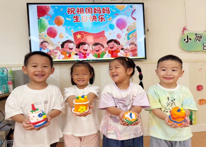 百种笔触·稚手绘爱:小班宝贝们化身小小艺术家,他们用小手小脚蘸上颜料,吹出漫天绚烂的“烟花”,印出美丽的国旗和爱心树;他们用五彩黏土,为祖国妈妈制作了甜甜的“生日蛋糕”……每一幅作品都充满了天真烂漫的想象,承载着对祖国最美好的祝福。